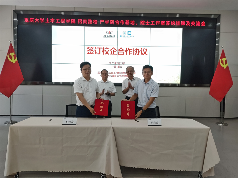 6月27日下午,招商交科下屬招商局重慶公路工程檢測中心有限公司(簡稱:招商路檢)與重慶大學土木工程學院在重慶招商路檢數(shù)據(jù)中心舉行“產(chǎn)學研合作基地”和“院士工作室”簽約揭牌儀式。招商交科黨委書記、董事長