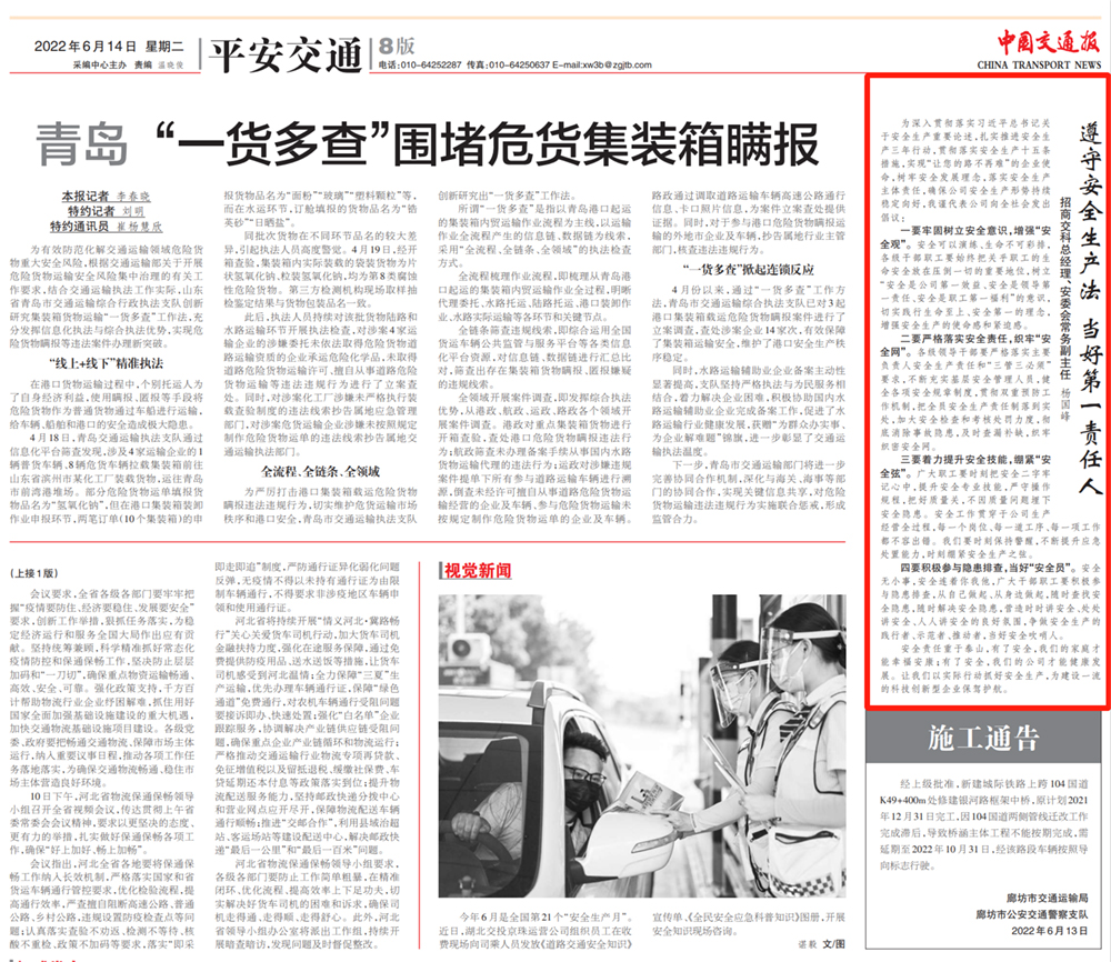 《中國交通報(bào)》刊發(fā)招商交科楊國峰安全生產(chǎn)倡議