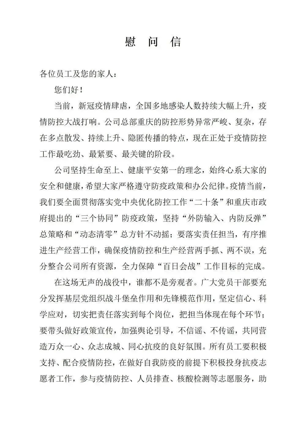 中宇公司工會(huì)也發(fā)布了慰問(wèn)信對(duì)疫情期間員工心里健康進(jìn)行疏導(dǎo)、對(duì)員工因疫情居家封控的辛苦進(jìn)行慰問(wèn)。