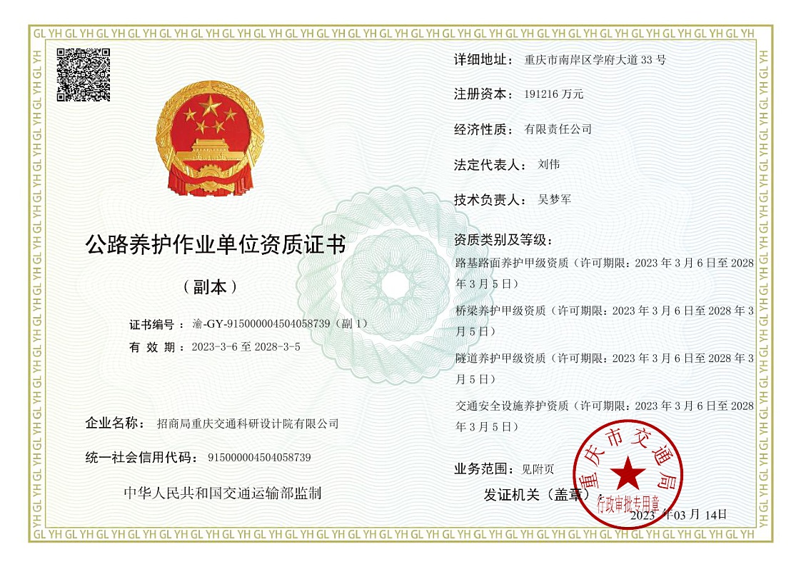 根據(jù)《公路養(yǎng)護作業(yè)單位資質(zhì)管理辦法》(交通運輸部令2021年第22號)規(guī)定,上述資質(zhì)適用于招商交科在全國范圍內(nèi)承接公路養(yǎng)護作業(yè)業(yè)務(wù)。其中,路基路面養(yǎng)護甲級資質(zhì)可以承擔(dān)各等級公路路基路面(含綠化)的各類養(yǎng)護工程,橋梁養(yǎng)護甲級資質(zhì)可以承擔(dān)所有公路橋梁的各類養(yǎng)護工程,隧道養(yǎng)護甲級資質(zhì)可以承擔(dān)所有公路隧道土建結(jié)構(gòu)的各類養(yǎng)護工程,交通安全設(shè)施養(yǎng)護資質(zhì)可以承擔(dān)各等級公路交通安全設(shè)施的各類養(yǎng)護工程。