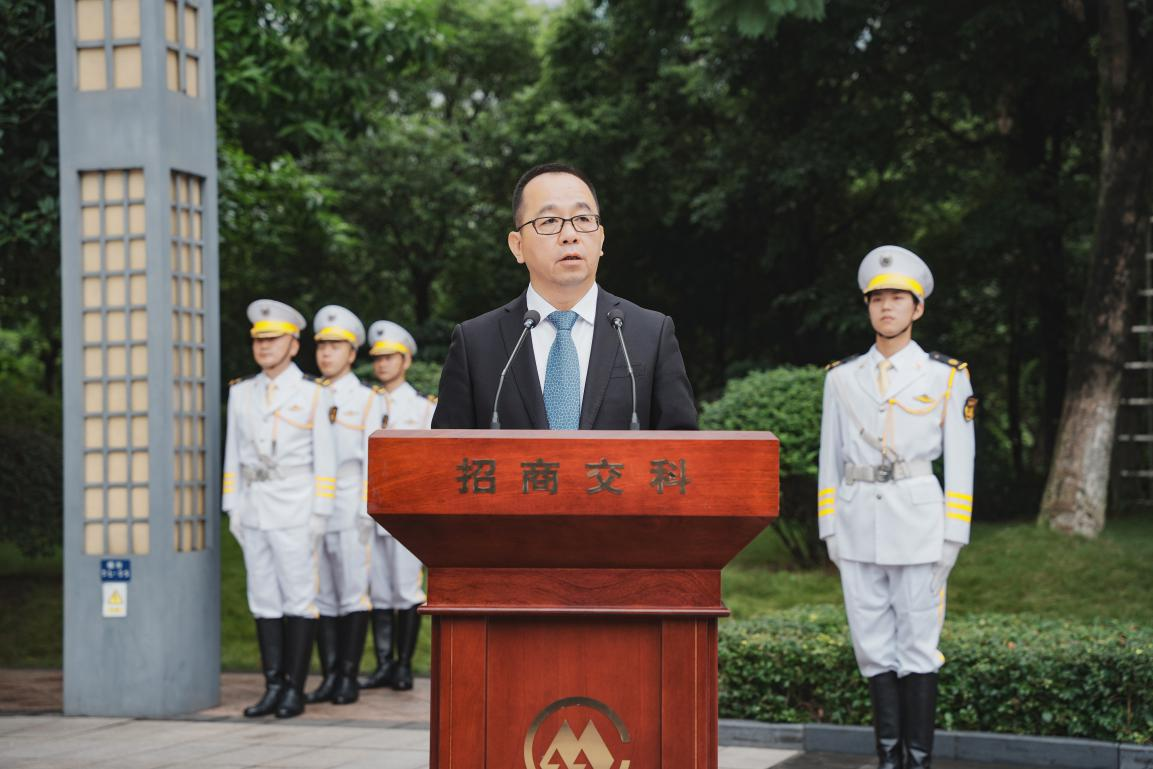 升旗儀式上,身著白色制服的儀仗隊員護著國旗、招商局旗,邁著整齊的步伐走向升旗臺。在《國歌》和《招商局之歌》的莊嚴(yán)歌聲中,五星紅旗和招商局旗先后冉冉升起,迎風(fēng)飛揚。