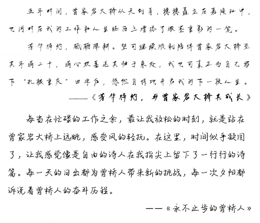 《芳華待灼,與曾家?guī)r大橋共成長》仿佛看到了作者與曾家?guī)r大橋一同砥礪深耕,“扎根重慶”時流下的汗水?!洞髳蹮o疆曾橋人 科技賦能優(yōu)服務》描繪了曾橋人如何用自己的智慧賦予了大橋生命?!队啦恢共降脑鴺蛉恕酚貌煌囊暯钦宫F(xiàn)出了大橋建設過程中的艱辛……員工們通過一個個微小平凡的故事,表達了與曾家?guī)r大橋的共情共鳴,也讓大家感受到一座蓬勃向上、鮮活而生動的曾家?guī)r大橋。