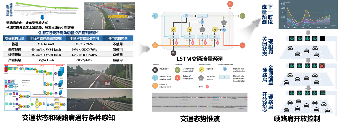 團(tuán)隊提出安全導(dǎo)向、效率提升的樞紐互通上游段硬路肩定向定車型開放策略及運(yùn)行管理方式;研發(fā)了仿真推演驅(qū)動的硬路肩動態(tài)管控算法,以及基于機(jī)器視覺的硬路肩路面狀況實時監(jiān)測算法;基于“交通狀態(tài)感知-交通流量預(yù)測-交通態(tài)勢推演-硬路肩開放”,實現(xiàn)了交通流量激增下,高速公路樞紐互通上游段硬路肩動態(tài)管控。硬路肩動態(tài)開放應(yīng)用在樞紐互通上游段可提升20%以上的通行能力,相當(dāng)于新增了一個行車道。