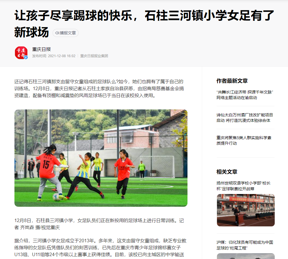 【轉(zhuǎn)載】重慶日?qǐng)?bào):讓孩子盡享踢球的快樂(lè),石柱三河鎮(zhèn)小學(xué)女足有了新球場(chǎng)