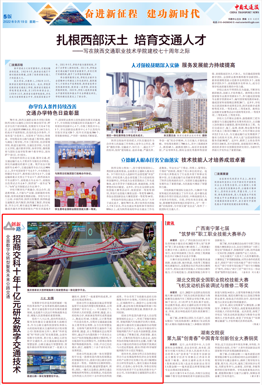 【編者按】2022年9月19日,《中國(guó)交通報(bào)》在第五版全文刊發(fā)了數(shù)字化中心文章《全面數(shù)字化轉(zhuǎn)型聚焦未來公路交通——招商交科十年十億元研發(fā)數(shù)字交通技術(shù)》。文章梳理了黨的十八大以來,公司在數(shù)字交通領(lǐng)域取得的系列成就,同時(shí)聚焦未來交通,公司將積極主動(dòng)的把握機(jī)遇,努力打造核心優(yōu)勢(shì),服務(wù)交通強(qiáng)國(guó)重大戰(zhàn)略任務(wù)?,F(xiàn)將全文轉(zhuǎn)載如下: