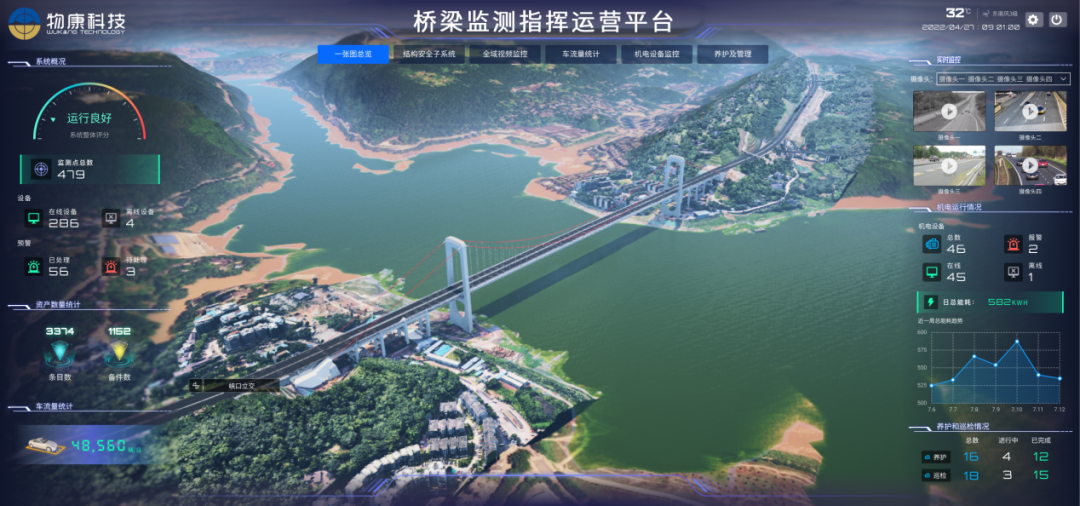 2023年1月,由招商交科主持設(shè)計的國內(nèi)最大跨度公軌兩用懸索橋——重慶郭家沱長江大橋正式通車,基于“1+1+1+N”結(jié)構(gòu)安全監(jiān)測體系研發(fā)而成的物康科技新一代數(shù)字化產(chǎn)品“大型基礎(chǔ)設(shè)施結(jié)構(gòu)安全智能監(jiān)測平臺”同步發(fā)布并投入使用。該平臺集成數(shù)字資產(chǎn)管理、結(jié)構(gòu)安全監(jiān)測、車流量監(jiān)測、全域視頻監(jiān)控、異常事件檢測、巡檢管養(yǎng)、應(yīng)急搶險7大功能;具備多場景、全生命周期管理,全要素、多尺度監(jiān)測,跨層級、多端交互,邊緣計算、邊云協(xié)同,數(shù)字孿生、虛實交互,多環(huán)境、多云部署6大能力,擁有1套精細化閉環(huán)運營管理體系,可實現(xiàn)“一屏觀全域”“一網(wǎng)管全局”“一鍵統(tǒng)指揮”的效果,有效提升運營管理智能化、智慧化水平,實現(xiàn)橋梁管養(yǎng)降本增效。