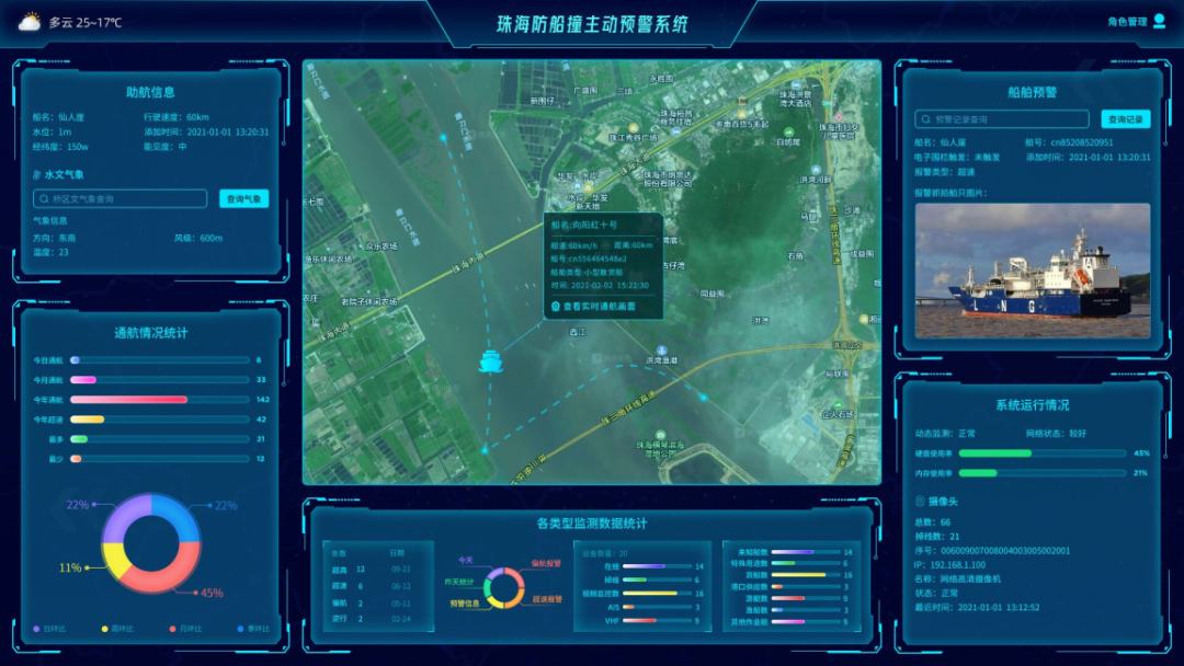 物康科技的主動防船撞系統(tǒng)通過自動識別系統(tǒng)(AIS)、熱成像、雷達、圖像識別等技術(shù)對涉水橋區(qū)的船舶通行高度、航速、航行軌跡及航向等進行全天候?qū)崟r自動監(jiān)測,利用甚高頻、船用電笛、燈光等信號對橋區(qū)船舶進行預(yù)報或預(yù)警以輔助船舶安全通過橋區(qū),降低船舶刮擦或碰撞橋梁的風險。同時,該系統(tǒng)還可以對已發(fā)生的船舶刮擦或碰撞事件進行及時取證和報警,還原事故過程。