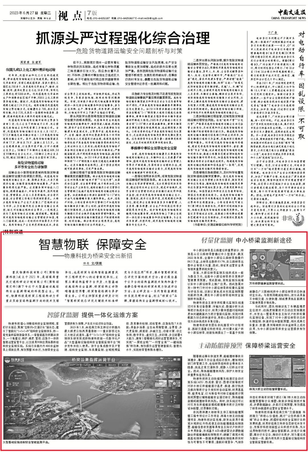 6月27日,在物康科技成立2周年之際,《中國交通報》在第七版和微信公眾號全文刊發(fā)了文章《智慧物聯(lián) 保障安全——物康科技為橋梁安全出新招》。文章詳細介紹了物康科技在結(jié)構(gòu)監(jiān)管平臺開發(fā)、大型基礎(chǔ)設(shè)施結(jié)構(gòu)安全監(jiān)測、橋梁結(jié)構(gòu)主動防碰撞監(jiān)控預(yù)警、橋梁智能檢測與養(yǎng)護等領(lǐng)域的技術(shù)和能力?,F(xiàn)將全文轉(zhuǎn)載如下: