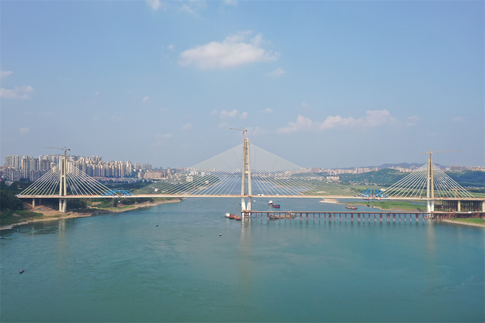 瀘州長江六橋于2016年1月開工建設(shè),是目前世界上在建最大公軌兩用三塔斜拉橋,橋梁全長1722米,主橋采用三塔斜拉橋設(shè)計,長1080米,近期為雙向八車道,遠(yuǎn)期為雙向六車道+軌道通道公軌兩用大橋。大橋計劃于今年年底正式通車,通車后將改善當(dāng)?shù)氐某鲂袟l件,助力成渝雙城經(jīng)濟(jì)圈建設(shè)。